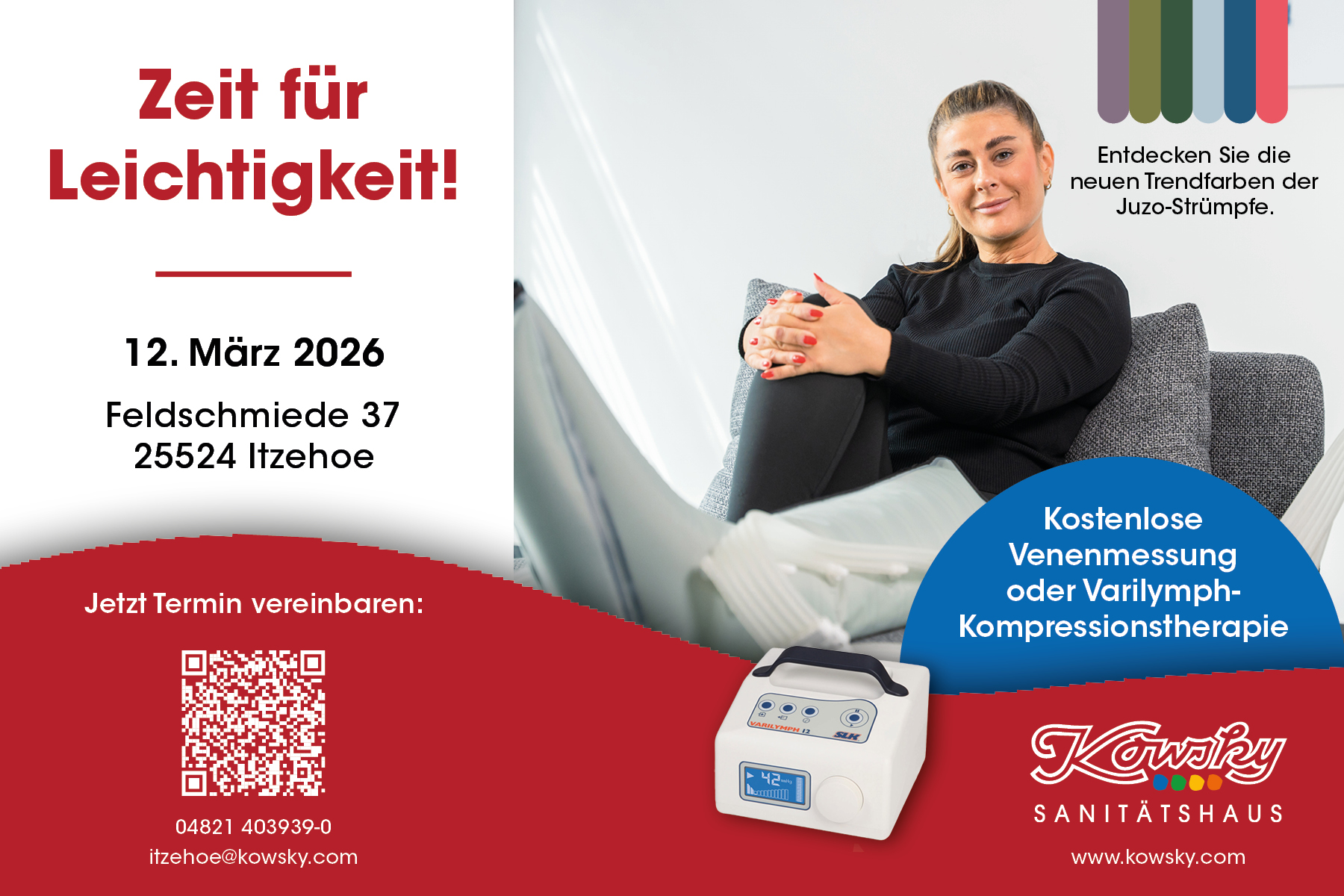 Am 12. März 2026 begrüßen wir Sie herzlich in unserer Filiale in der Feldschmiede 37 in Itzehoe. Unser Aktionstag steht unter dem Motto „Kompression für Leichtigkeit“ und widmet sich ganz dem Thema Venengesundheit.