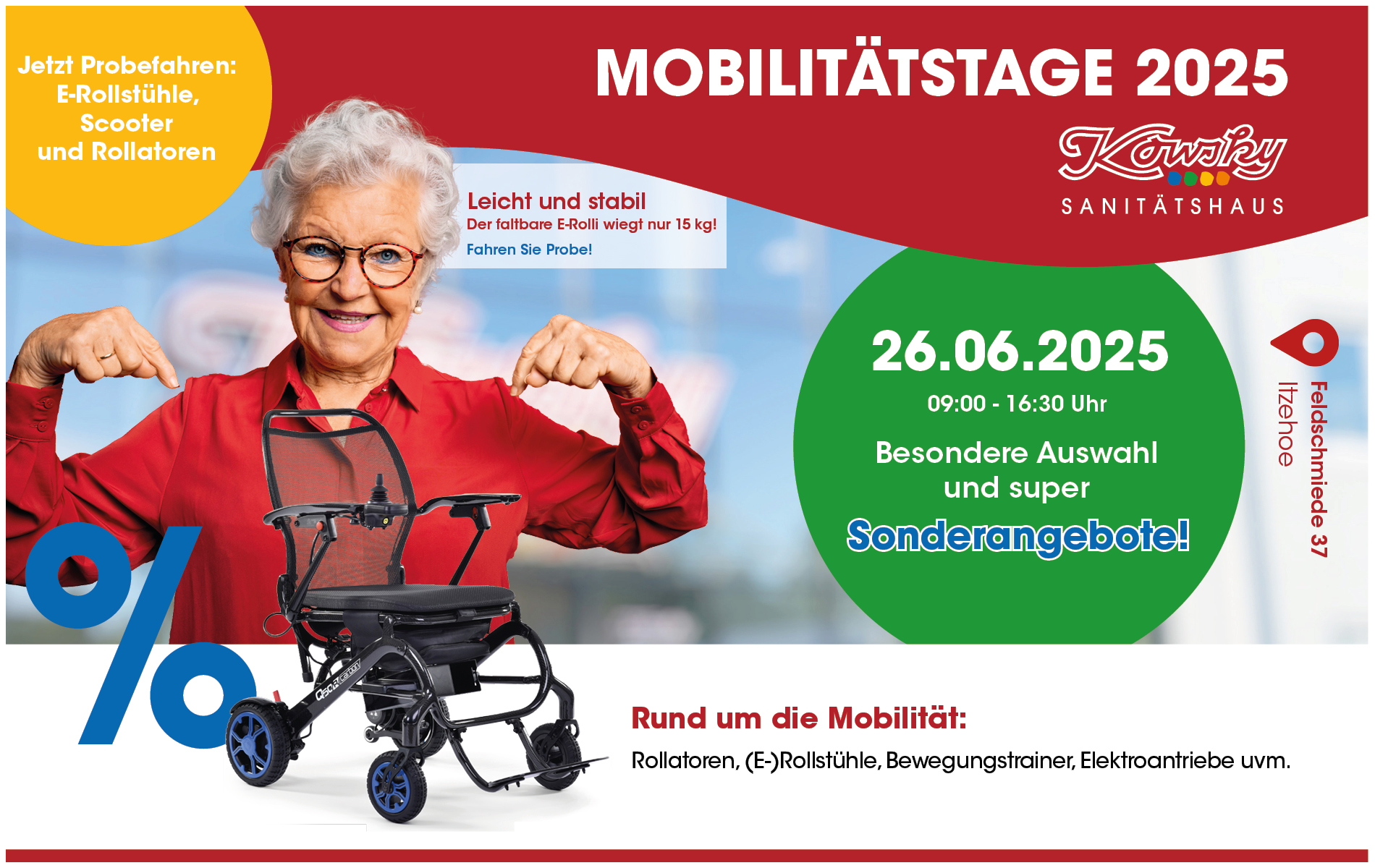 Am Donnerstag, dem 16. Oktober 2025, lädt das Sanitätshaus Kowsky zu einem informativen Mobilitätstag in Bad Segeberg ein. In der Zeit von 9:00 bis 16:00 Uhr haben Besucherinnen und Besucher in der Kurhausstraße 14 die Möglichkeit, moderne Mobilitätshilfen kennenzulernen und direkt vor Ort auszuprobieren.